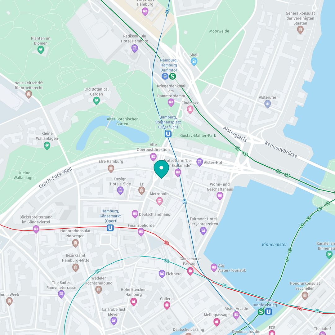 Our office is located between Gänsemarkt and Dammtor station, right in the heart of central Hamburg. Our location is particularly popular with staff thanks to its excellent accessibility – whether by bike or public transport.